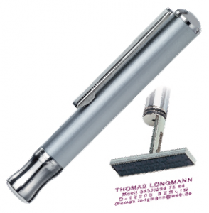 Es sind bis zu 5.000 Abdrucke mit einem Farbkissen möglich. (Reisestempel - Gerät mit Stempel) Wie ein normaler Kugelschreiber aussehender Reisestempel mit integriertem Stempelkissen.