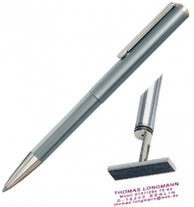Es sind bis zu 5.000 Abdrucke mit einem Farbkissen möglich.Kugelschreiberstempel (Stempelkugelschreiber - Kugelschreiber mit Stempel) Wie ein normaler Kugelschreiber aussehender Kugelschreiberstempel mit integriertem Stempel und Stempelkissen. Dieser Artikel ist ein kleines technisches Meisterwerk, das in einem sehr eleganten und hochwertigen Kugelschreiber einen Stempel mit eingebautem Stempelkissen integriert.