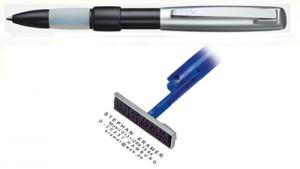 Der Kugelschreiberstempel hat eine max. 4 Zeilige Textplatte und ein sehr ausgeklügeltes und durchdachtes mechanisches System mit hoher Präzision. Hier liegt der Stempelteil im Inneren von dem Kugelschreiber-Stempel verborgen und verschwindet ganz im schlanken Gehäuse des Kugelschreibers.
