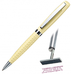Stempelkugelschreiber mit ergonomischer Grifffläche. Schreibgerätegehäuse aus antimicrobialem Kunststoff. Clip, Ring und Spitze aus verchromtem Metall. Präzisions-Stempelmechanik aus Metall.