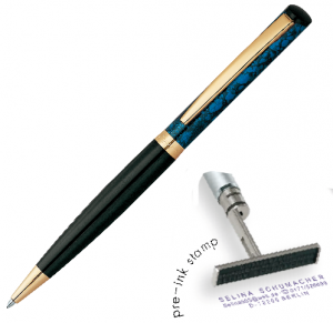 Eleganter Stempelkugelschreiber, schwarz und blau marmoriert, hartvergoldet, Ganzmetallgehäuse.