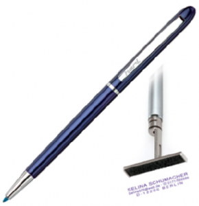 Es sind bis zu 5.000 Abdrucke mit einem Farbkissen möglich.Kugelschreiberstempel (Stempelkugelschreiber - Kugelschreiber mit Stempel) Wie ein normaler Kugelschreiber aussehender Kugelschreiberstempel mit integriertem Stempel und Stempelkissen. Dieser Artikel ist ein kleines technisches Meisterwerk, das in einem sehr eleganten und hochwertigen Kugelschreiber einen Stempel mit eingebautem Stempelkissen integriert.