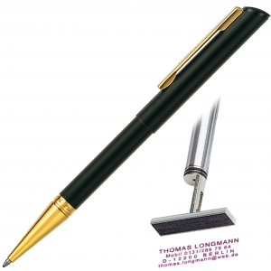 Eleganter Stempelkugelschreiber, Mattlackiert schwarz, 24k hartvergoldet. Ganzmetallgehäuse.
