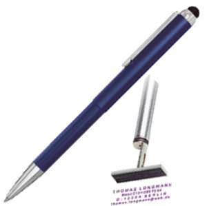 Kugelschreiber und Stempel in einem – privat so praktisch wie im Büro. Individuell mit Ihrem Namen, Ihrer Adresse und Telefonnummer gefertigt. Sie brauchen keinen extra Stempel, kein Stempelkissen mehr. Mit diesem Stempelstift von onlinestempel24.com haben Sie beides immer parat, egal wo Sie sind. Nehmen Sie einfach die Hülse ab: sogleich klappt der Stempel heraus und Sie können im Nu Ihre Papiere markieren. Ob als Absender für Ihren Brief, Adresse für einen Gesprächspartner bei einem Treffen, oder zur Kennzeichnung Ihrer Bücher, die Möglichkeiten sind beinahe unbegrenzt. Der hochwertige Microschaumstempel kommt ohne Stempelfarbe aus und trocknet nie aus. Schon wenige Tage nach der online-Bestellung erhalten sie Ihren onlinestempel24.com Stempelstift. Microschaumstempel bis 4 Zeilen für bis zu 5'000 Abdrucke, nachfärbbar. Die Grossraummine ist ersetzbar mit System "Parker Jumbo".