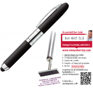Kugelschreiber und Stempel in einem – privat so praktisch wie im Büro. Individuell mit Ihrem Namen, Ihrer Adresse und Telefonnummer gefertigt. Sie brauchen keinen extra Stempel und kein Stempelkissen mehr. Mit diesem Stempelstift von onlinestempel24.ch haben Sie beides immer parat, egal wo Sie sind. Nehmen Sie einfach die Hülse ab: sogleich klappt der Stempel heraus und Sie können im Nu Ihre Papiere markieren. Ob als Absender für Ihren Brief, Adresse für einen Gesprächspartner bei einem Treffen, oder zur Kennzeichnung Ihrer Bücher, die Möglichkeiten sind beinahe unbegrenzt.