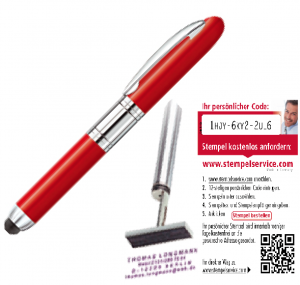 Kugelschreiber und Stempel in einem – privat so praktisch wie im Büro. Individuell mit Ihrem Namen, Ihrer Adresse und Telefonnummer gefertigt. Sie brauchen keinen extra Stempel und kein Stempelkissen mehr. Mit diesem Stempelstift von onlinestempel24.ch haben Sie beides immer parat, egal wo Sie sind. Nehmen Sie einfach die Hülse ab: sogleich klappt der Stempel heraus und Sie können im Nu Ihre Papiere markieren. Ob als Absender für Ihren Brief, Adresse für einen Gesprächspartner bei einem Treffen, oder zur Kennzeichnung Ihrer Bücher, die Möglichkeiten sind beinahe unbegrenzt.
